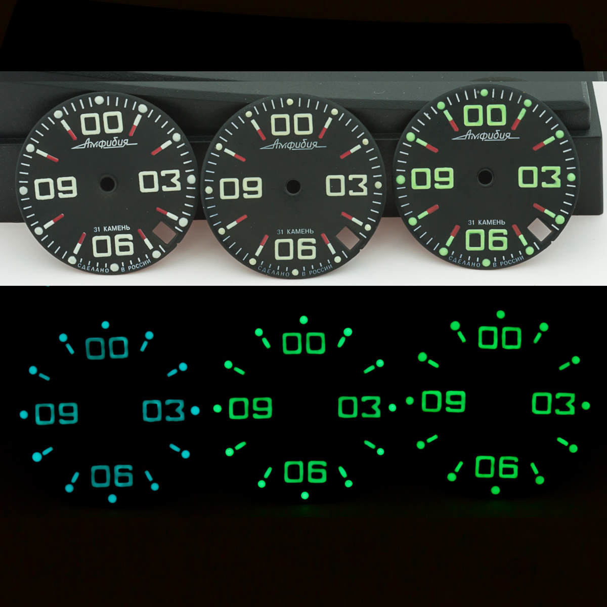 • Ниже можете видеть примеры работ, на видео - к сожалению камера с трудом показывает как на самом деле выглядит свечение в темноте, но разница настоящего швейцарского люма Superluminova с заводским люмом от Восток - там очевидно оценить можно (на камере заводской люм вообще светит слабо слабо - это связано с чувствительностью камеры конечно). Наш люм светится примерно также как на японских Сейко, правда зависит от дизайна символов. На циферблатах нашей разработки - свечение порой превосходит японцев, так как мы наносим люм вручную, не машинопечатью. Переходите и подписывайтесь также в наши соцсети, присылайте туда фото проектов сделанных с нашими деталями - опубликуем и конечно будем дружить!