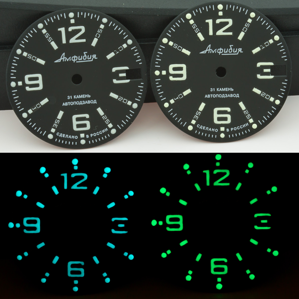 • Ниже можете видеть примеры работ, на видео - к сожалению камера с трудом показывает как на самом деле выглядит свечение в темноте, но разница настоящего швейцарского люма Superluminova с заводским люмом от Восток - там очевидно оценить можно (на камере заводской люм вообще светит слабо слабо - это связано с чувствительностью камеры конечно). Наш люм светится примерно также как на японских Сейко, правда зависит от дизайна символов. На циферблатах нашей разработки - свечение порой превосходит японцев, так как мы наносим люм вручную, не машинопечатью. Переходите и подписывайтесь также в наши соцсети, присылайте туда фото проектов сделанных с нашими деталями - опубликуем и конечно будем дружить!